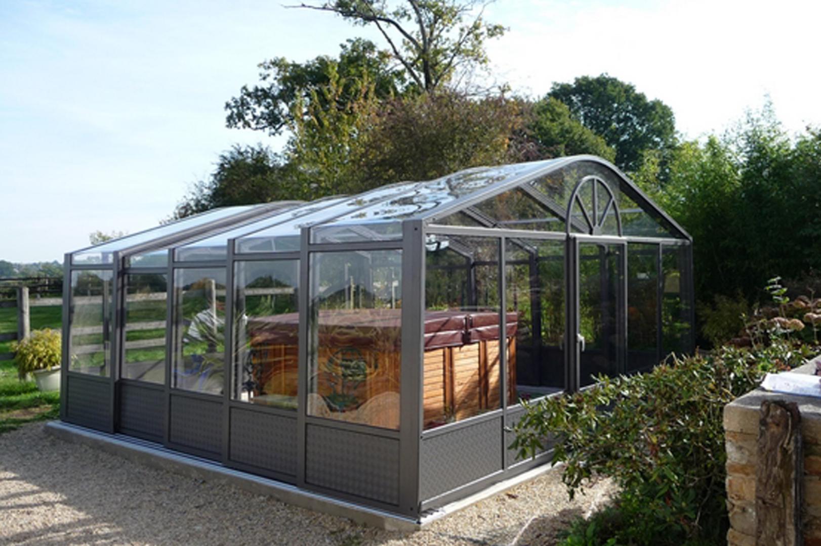 La rotonde coulissante pour spa est un abri ultra fonctionnel qui s'adape à tous les modèles de spas. Le diamètre s"adapte selon votre terrasse. Ici, finition aluminium en gris anthracite et vitrage polycarbonate plein transparent incassable d'épaisseur 4 mm. Ouverture à 180 ° et orientation de l'espace ouvert selon votre besoin. Réalisation en photo : spa de 2 m x 2 m et rotonde de 4 m extérieur, 3.8 m intérieur.