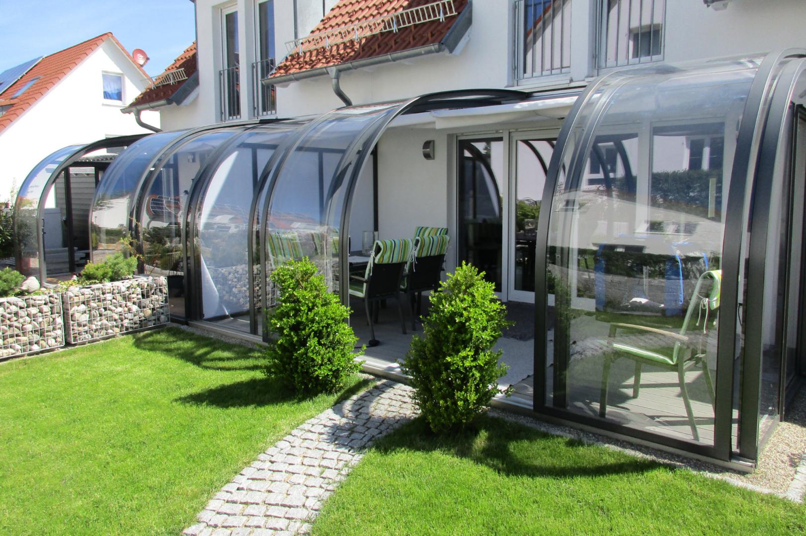 Gamme d'abris de terrasse coulissants cintrés ou à pans droits en forme de véranda traditionelle. La structure en aluminium est vitrée selon la finition désirée en verre feuilleté sécurit ou en verre synthétique incassable. Ce type de construction est idéal pour profiter au maximum de sa terrasse sans les inconvénient d'une construction fixe dont la toiture ne peut pas s'ouvrir en belle saison. Construction 100 % sur-mesure avec store de protection soalire manuel ou électrique intégré.