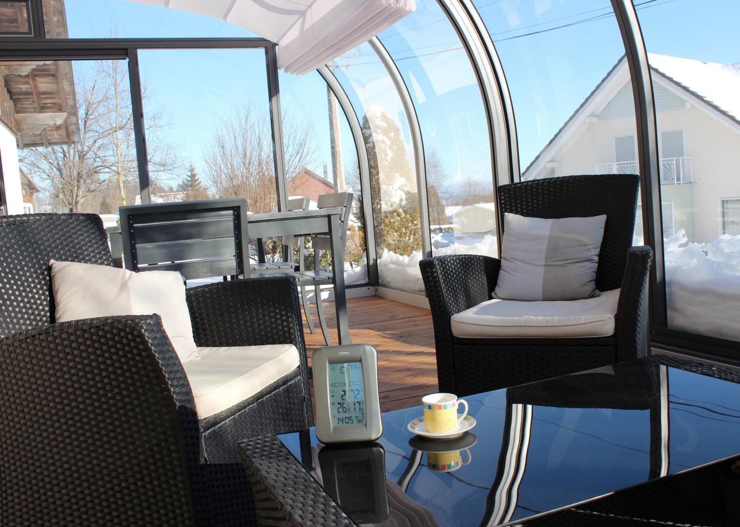 Ici, au mois de janvier, il fait environ -3°C à l'extérieur et environ 27°C sous l'abri terrasse