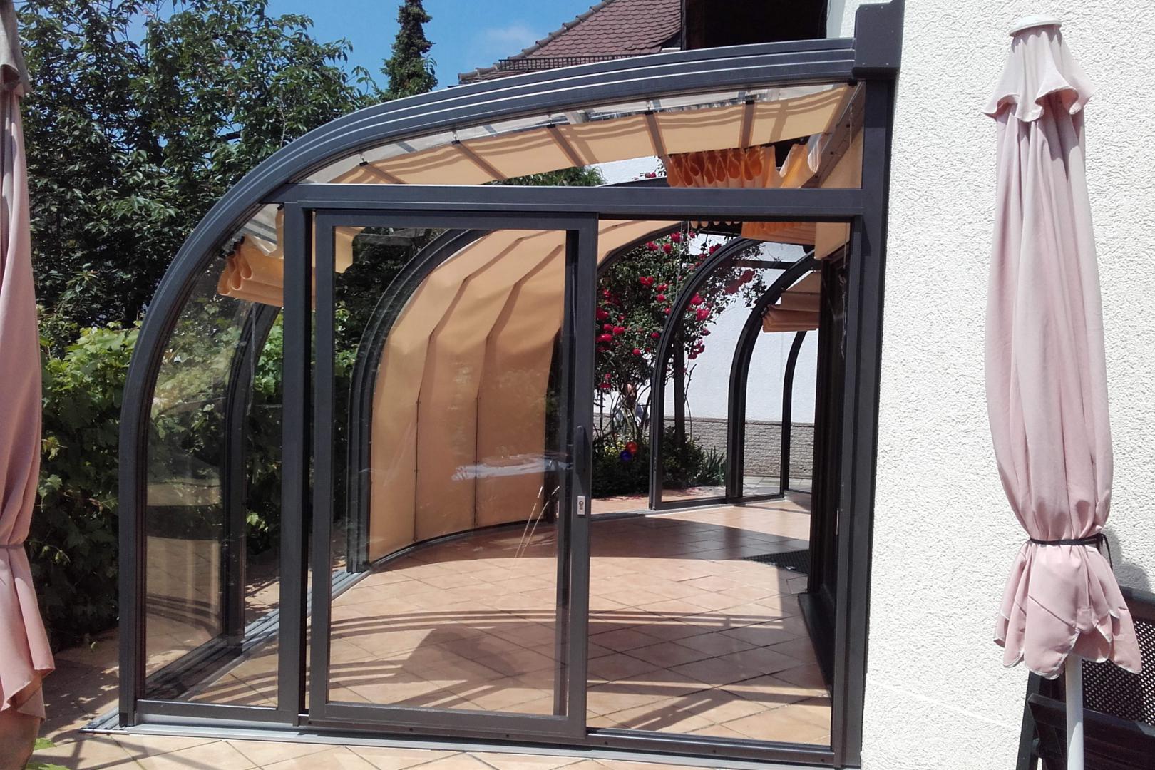 La gamme d’abris de terrasse Saphir, Topaz et Perle dispose d’une toiture transparente avec un store intégré qui vous protège du soleil en été et qui vous procure chaleur et lumière en intersaison ou en hiver.